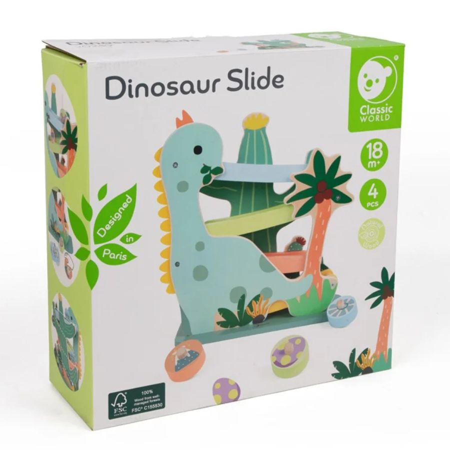 Step into a colourful prehistoric world with the Classic World Toys Dinosaur Slide. This vibrant, dino-themed wooden ramp invites toddlers aged 18 months+ to roll, race, and discover through dynamic play.