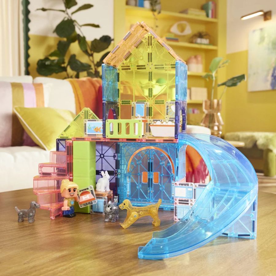 Open the double doors to a vibrant pet haven, where animals can climb furniture, glide down the new slide piece, and explore endless imaginative possibilities. The Mix & Match Animal Caretaker figure helps little ones care for their pets, while the microMAGS™ Cubes let them build furniture or tiny structures for exciting animal adventures. Create fun boundaries with fences and gates to keep that mischievous puppy out of the kitchen!