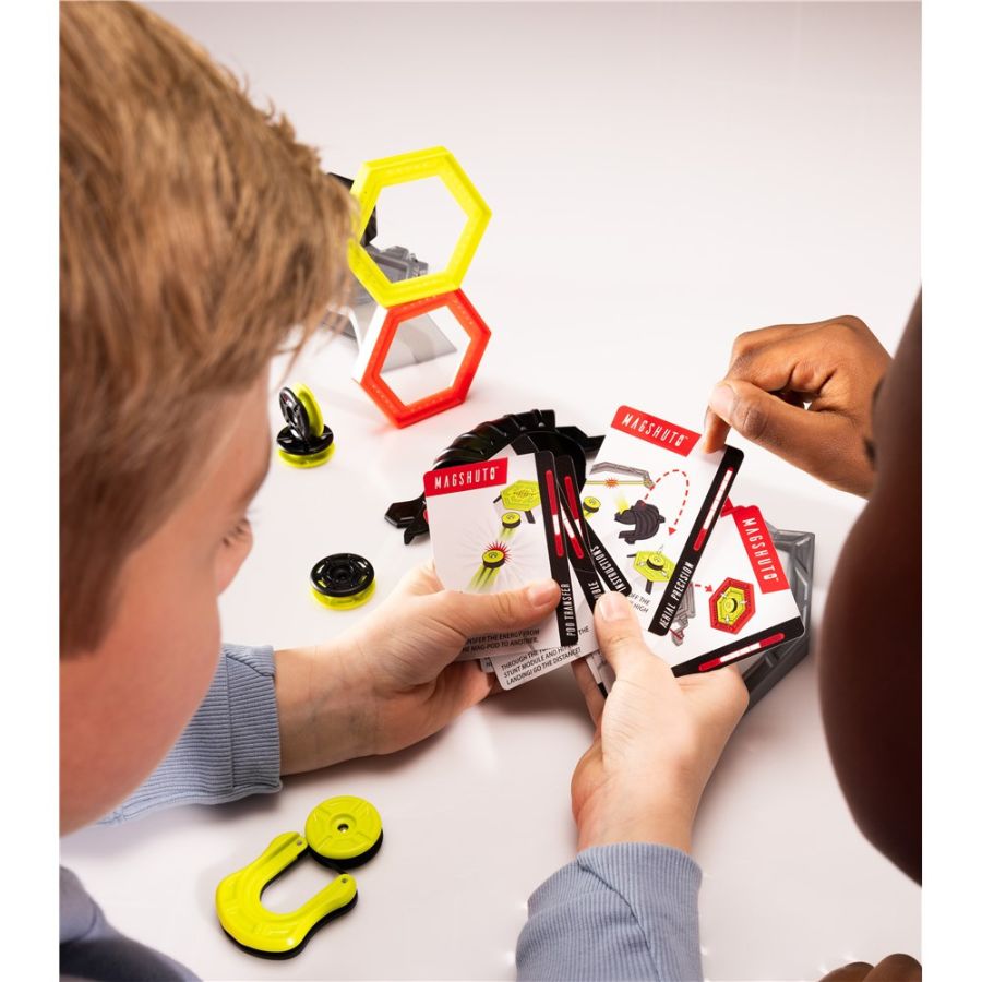 Load a Mag-Pod into the launcher, pull it back, aim, and launch! Watch as it flips, ricochets, glides through tunnels, and lands on target. With 15 challenge cards and endless ways to configure the pieces, kids can build, test, and perfect their wildest stunts—or invent new ones!