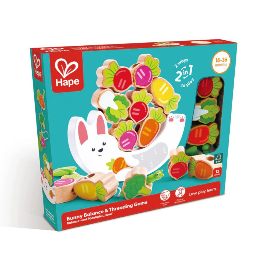 The Hape Bunny Balance & Threading Game is a delightful combination of stacking, threading, and sensory play that makes learning fun while helping toddlers develop essential motor, cognitive, and creative skills.