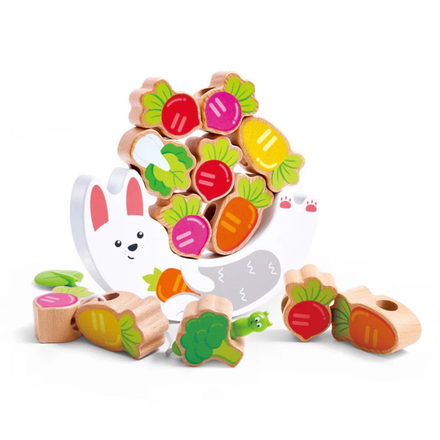 Children can place the bunny base, stack the wooden veggies, and thread them using the playful caterpillar rope. Each wobble and gentle tumble teaches balance, stability, and hand-eye coordination, while the vibrant shapes and colours help toddlers learn to recognise different vegetables and colours in a fun and engaging way.