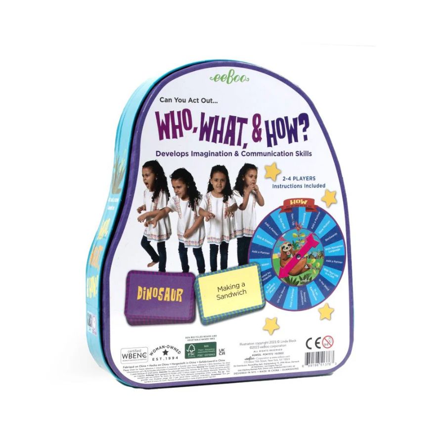 Includes: WHO, WHAT, and HOW cards; compact game box