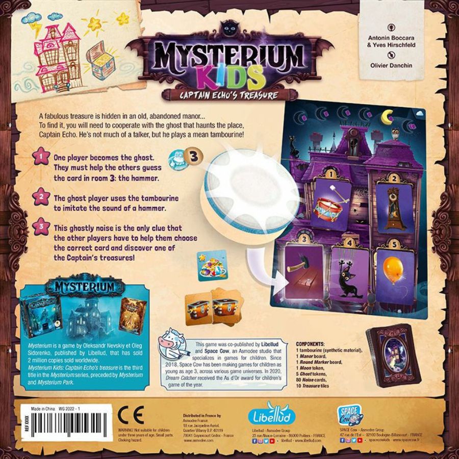 Designed for 2–6 players and perfect for ages 6 and up, this game invites young detectives into a mysterious mansion where the ghost of Captain Echo guides them using only a tambourine.