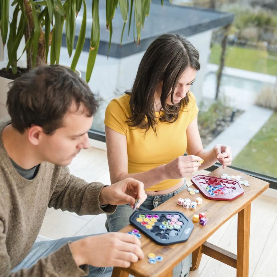 Smart Games Genius Gems is a fast-paced, strategic game that challenges players to race to fill the game board with colourful jewel pieces before their opponent.